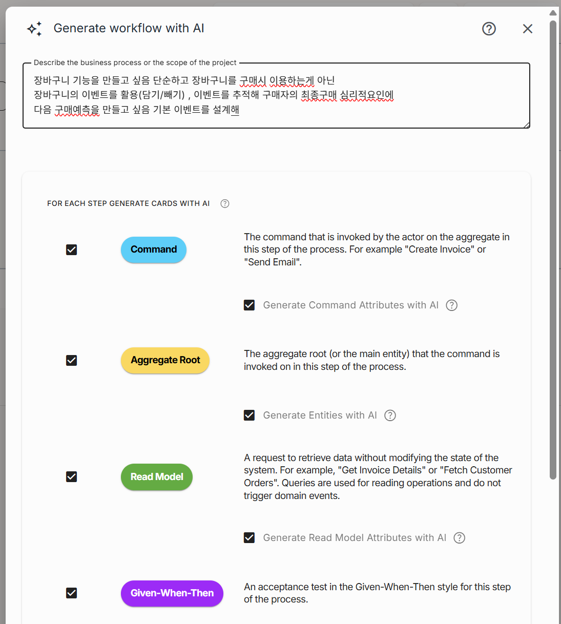 | Command | 데이터를 변경하는 요청 (예: 주문 생성) | Command, Aggregate Root, When |