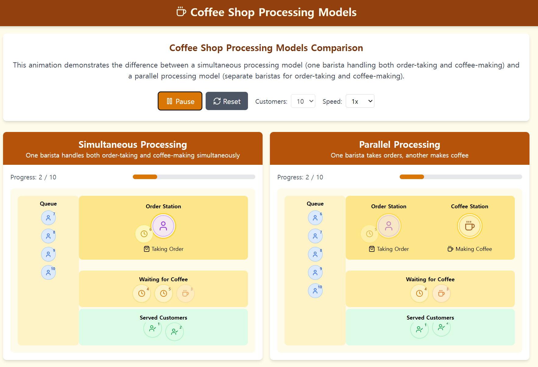 - 동시처리 : 한사람이 커피주문 받고 만들기를 동시에한다. 커피머신을 이용하면서도 주문을 받음 - 비동기 논블록킹 프로그래밍