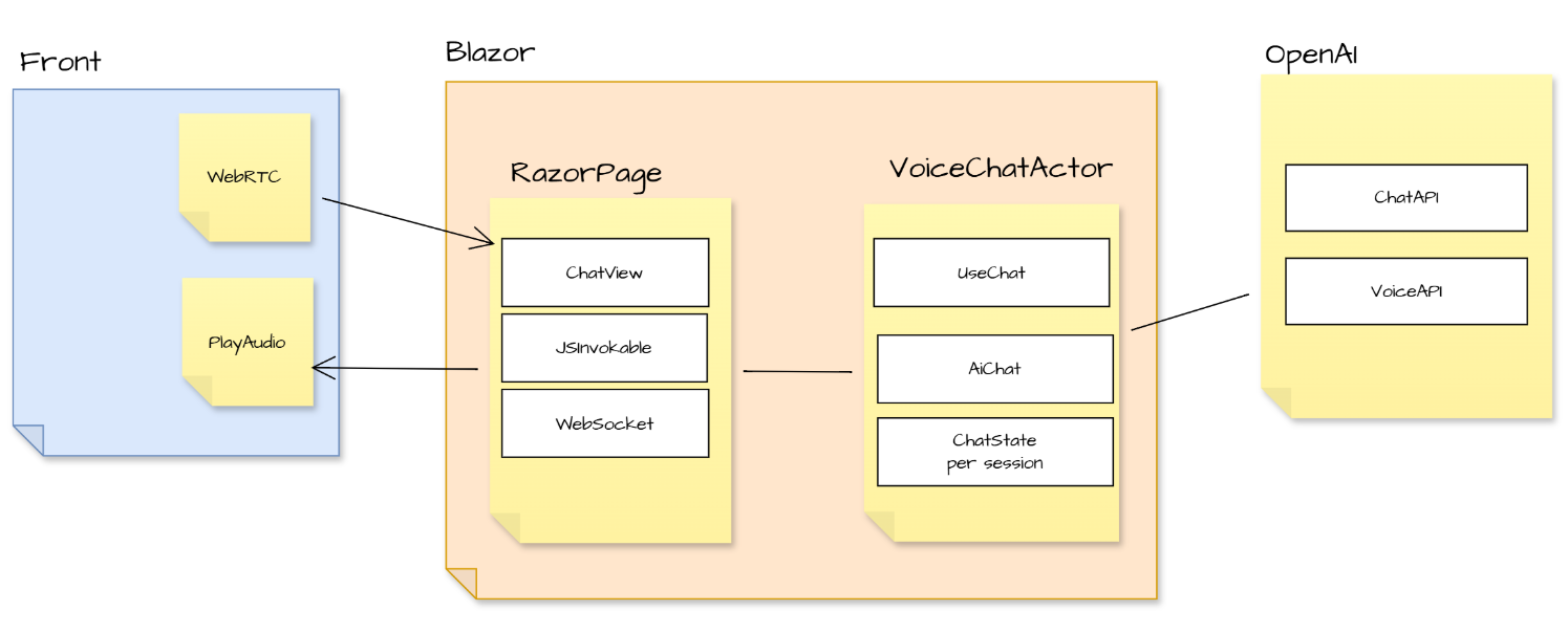 - 음성채팅 기능의 이벤트를 처리하며 OpenAI API를 이용하고~ blazor에게 완료를 수행해 UI업데이트및 최종 프론트에게 재생 스트림을 전달해 재생시킬수도 있습니다.