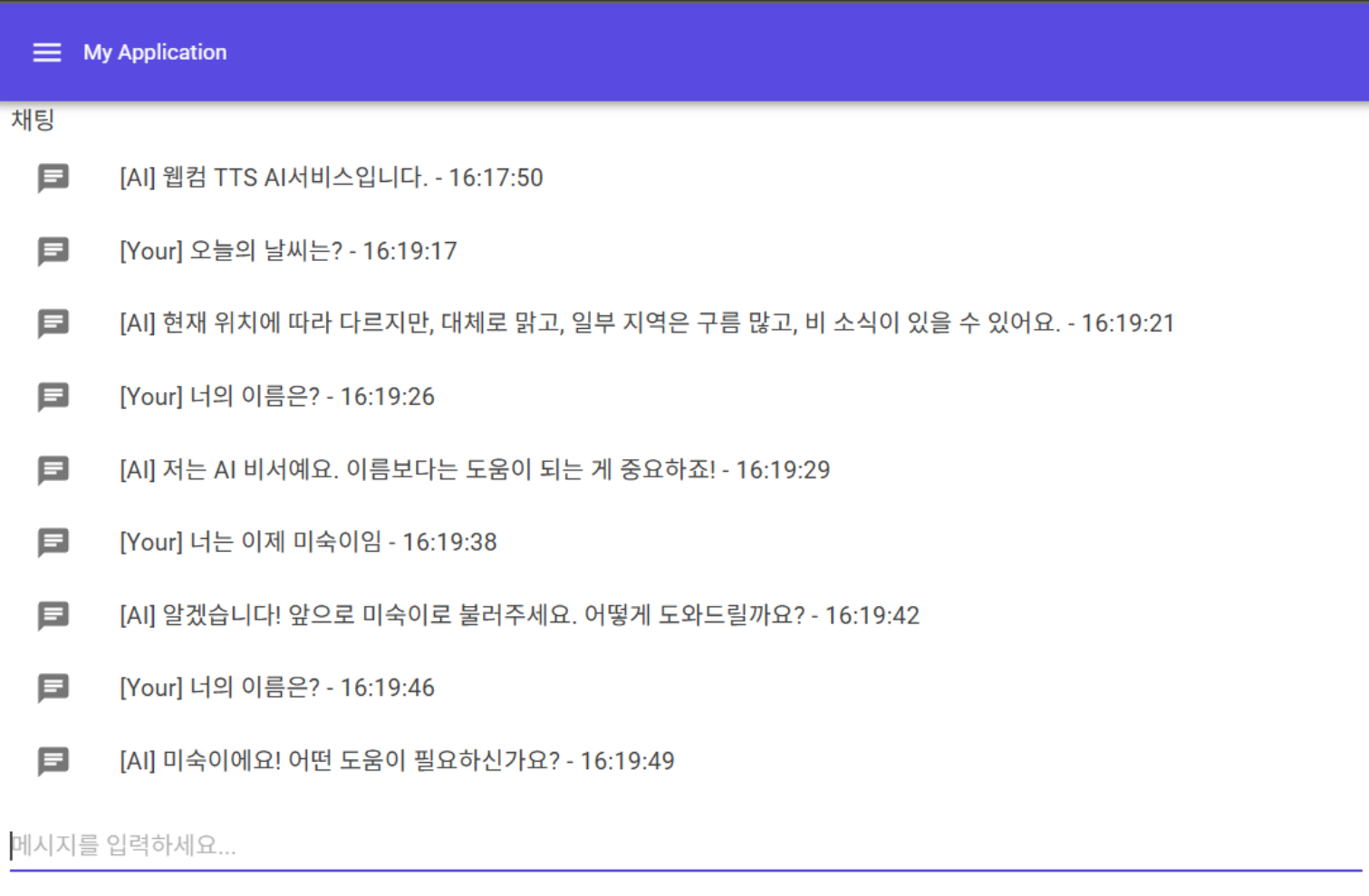 - 진행되는 대화내용은 텍스트로 표시되며 동시에 음성으로 출력됩니다. ( 음성을 내기 힘든 상황에서의 인풋형 음성채팅 )