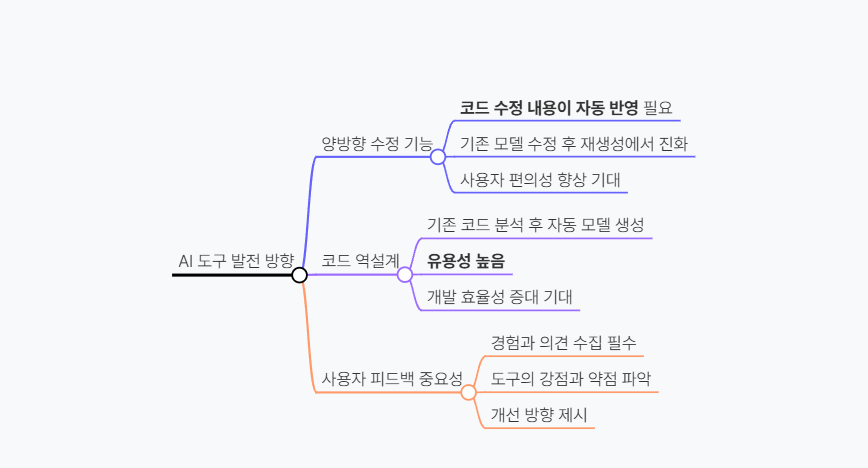 현재 모델을 수정하고 코드를 다시 생성하는 방식에서 나아가, 코드 수정 내용이 모델에 자동으로 반영되는 양방향 기능이 필요합니다.