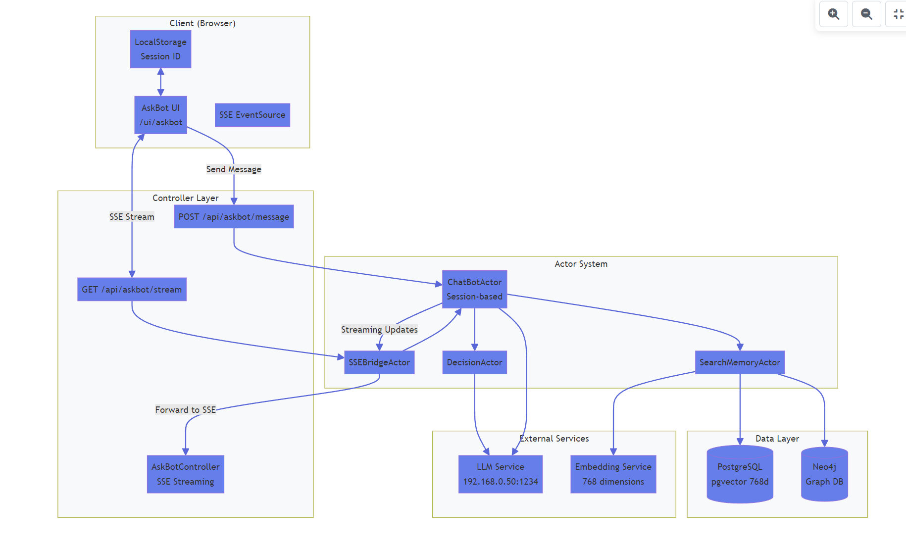 - ChatBotActor 액터는 추후 SSE와 연결되어 사용자의 대화요청을 처리받아 응답을 SSE로 스트리밍예정입니다. SSE는 당장 구현하지 않고 액터모델에서 스트림형태로 응답을 주는 형태로 구현합니다.