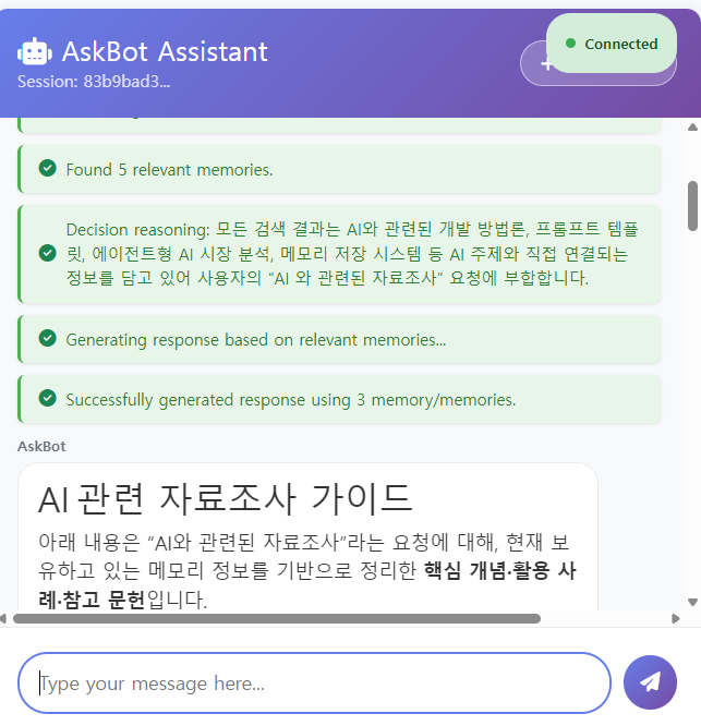 ASKBot 기능을 탑재해 대화 반응형으로 메모리를 검색하는 챗봇을 스텝별로 만들고자하며 다음 요구사항을 참고 새로운 기능을 추가해주세요