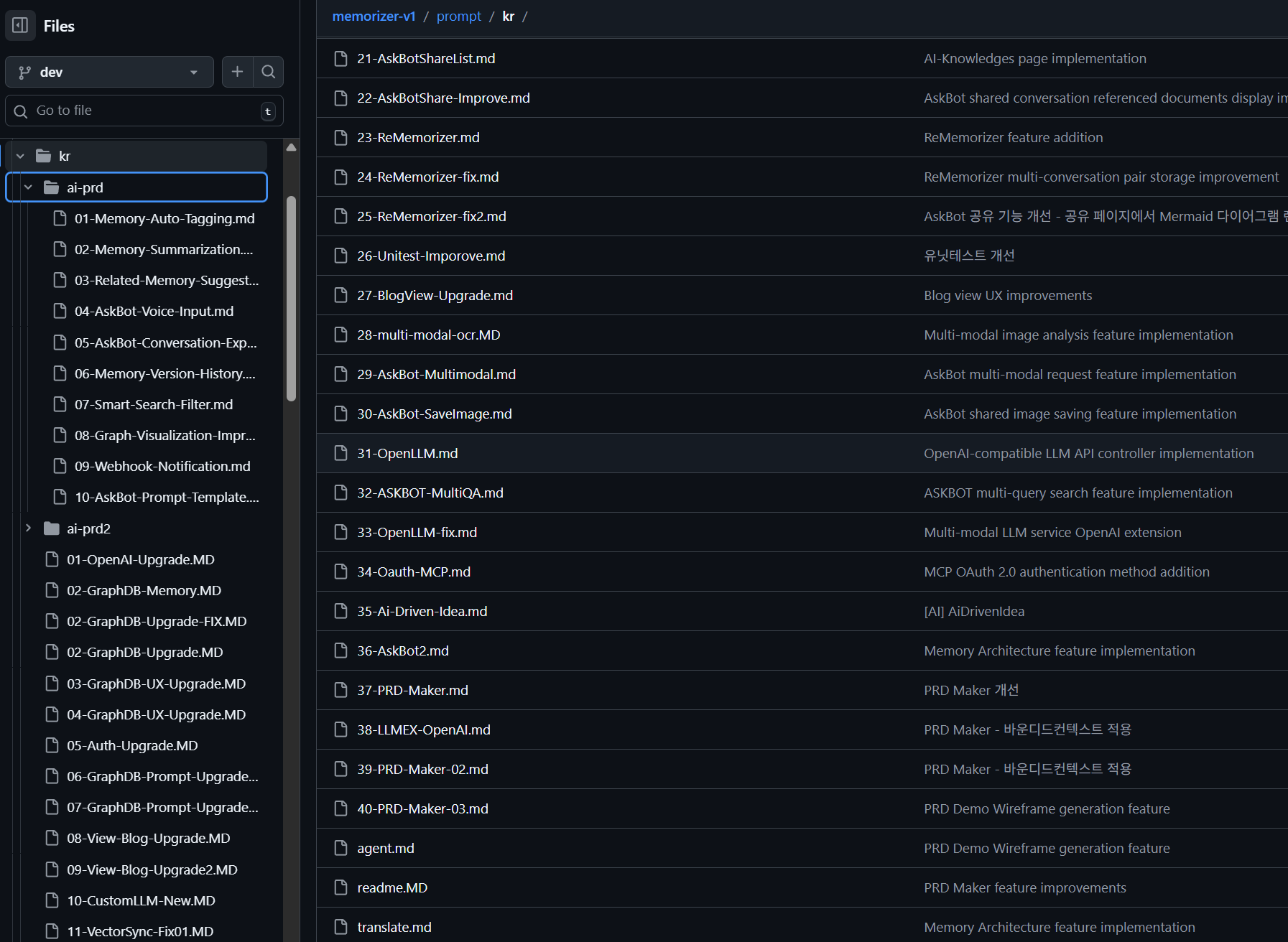 • ai-prd 디렉토리는  어느순간 기능개선 프롬프트 작성자체의 아이디어가 떨어져  기존프롬프트를 참고해 신규기능 프롬프트를 좀 생성해봐로 시도해 LLM이 생성한 신규기능 개발을 위한 프롬프트입니다.