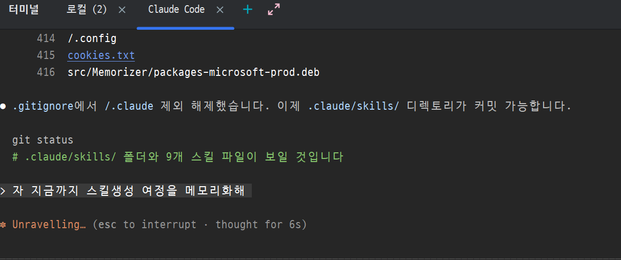 이제 생성된 스킬의 본방을 커밋하려고하니 파일이 하나도 없음 클로드코드의 설정은 개인화 설정으로 커밋방지를 초반에 걸어두어 해제 이것도 그냥 클코드한테 요청해서 진행 - 코딩 귀차니즘의 산출물