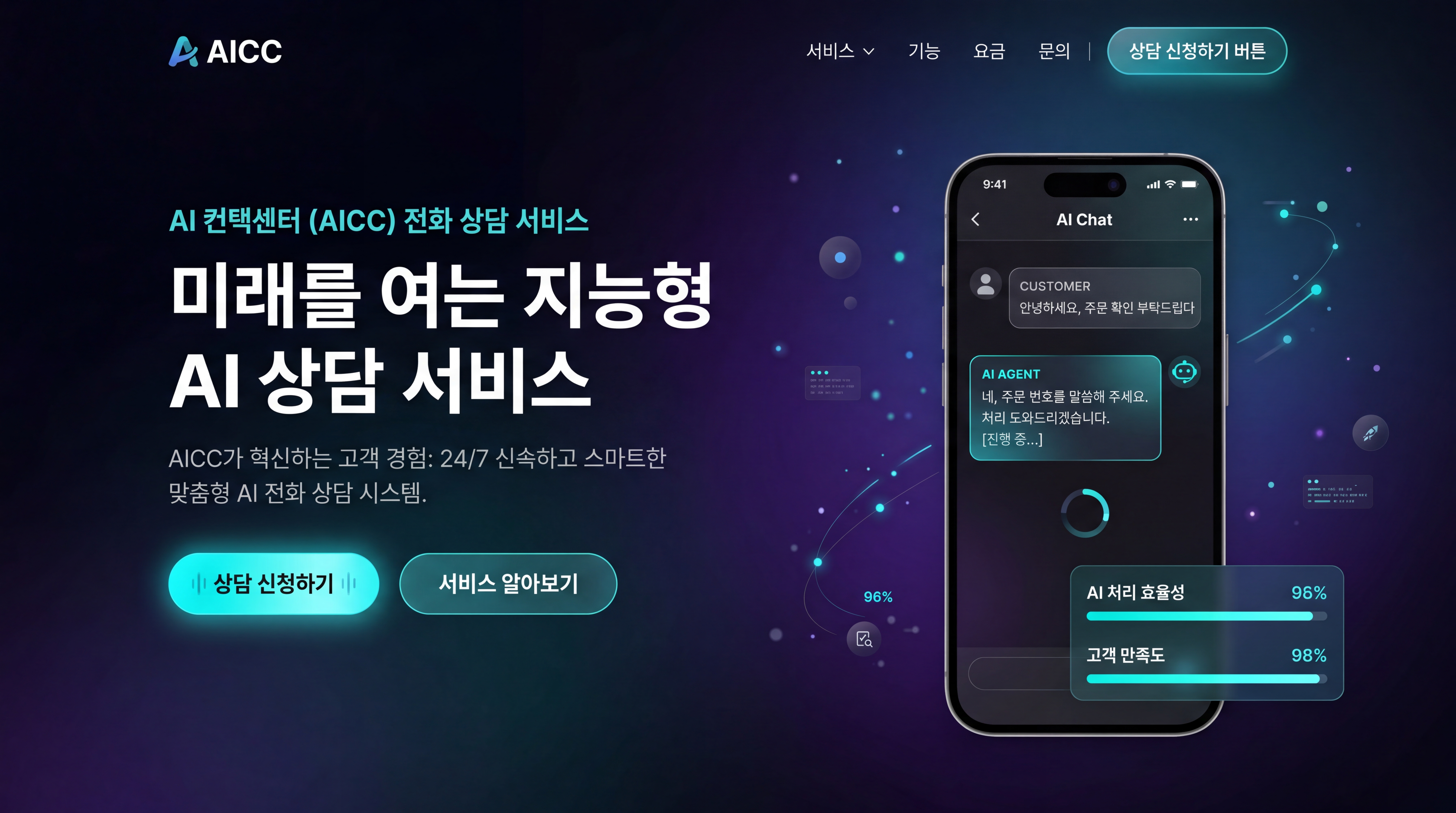 축적한 애니메이션 템플릿의 실전 활용을 검증하기 위해, “AICC 전화상담 도입” 테마의 랜딩페이지를 제작했습니다. Pencil 디자인 파일을 참조하여 가능한 한 많은 컴포넌트와 애니메이션 효과를 적용하는 것이 목표였습니다.