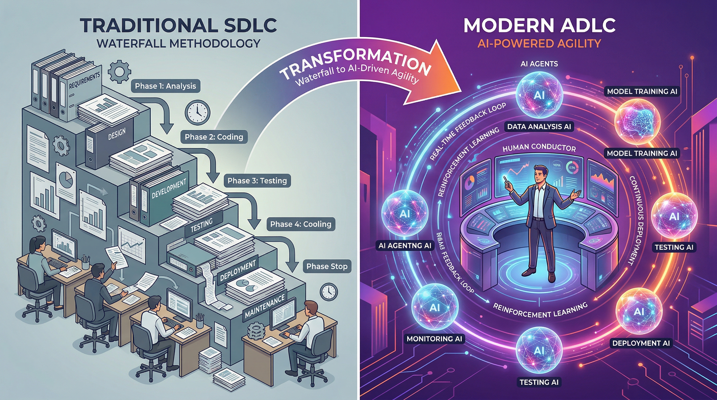 LLM의 인지 한계를 이해하면, 소프트웨어 개발 사이클 자체가 왜 변해야 하는지가 명확해진다. SDLC(Software Development Lifecycle)에서 ADLC(Agentic Development Lifecycle)로의 전환은 단순한 도구 교체가 아니라, 개발 사이클의 철학이 "순차적 생산"에서 "지속적 지능 협업"으로 이동하는 것이다.